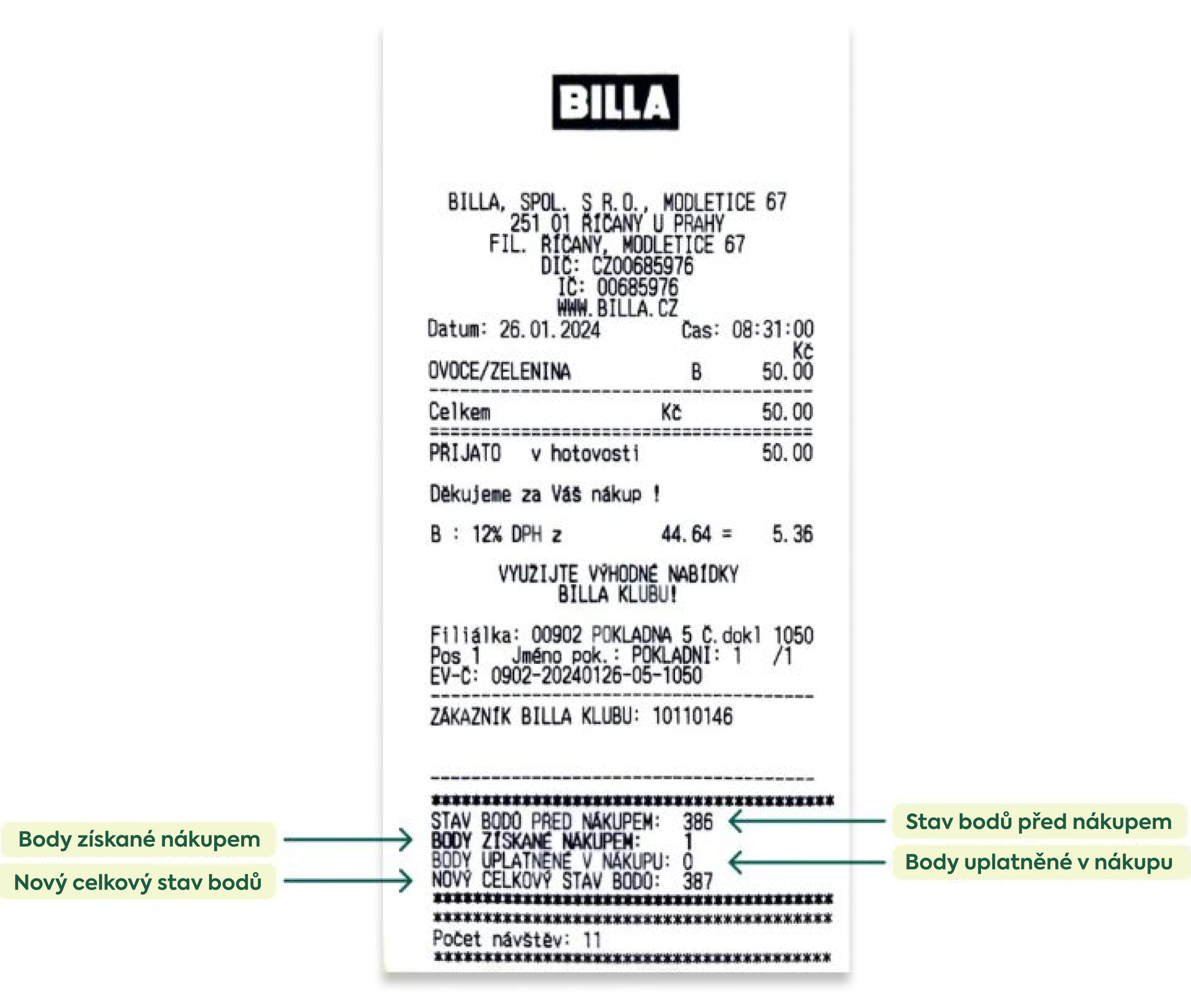 Celkový stav bodů, body získané nákupem najdete také ve spodní části vaší účtenky.