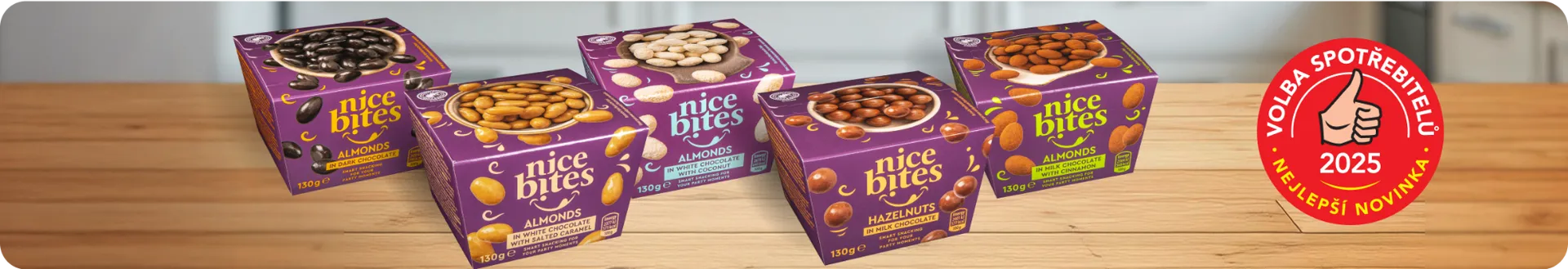 Dělá nám ohromnou radost, když naše práce dává smysl – a ještě větší, když ji oceníte i vy. Také letos jste ve Volbě spotřebitelů dali hlas našim výrobkům, a my si toho nesmírně vážíme. Čokoládová řada Nice Bites si odnáší ocenění za chuť, kvalitu i vaši přízeň. Je radost vyhrát – a ještě větší je vyhrát díky vám.