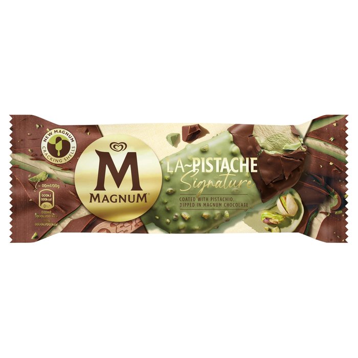 Magnum La Pistache přináší výjimečný pistáciový zážitek. Sametová zmrzlina s pistáciovou příchutí s krémovým pistáciovým středem, obalená v pistáciové polevě posypané karamelizovanými pistáciemi, a to částečně ponořeno do ikonické křupavé mléčné čokolády. Další pistáciová verze k dispozici také v kelímku a multipacku.