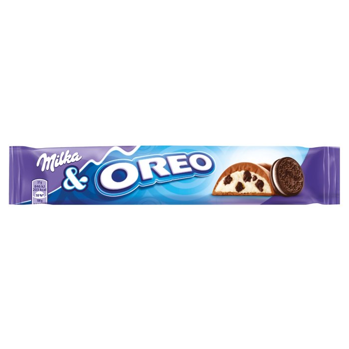 Kousky kakaových sušenek OREO v mléčném krému s vanilkovou příchutí v jemné mléčné čokoládě z alpského mléka Ideální tyčinka na cesty do batůžku, do kabelky anebo přímo do ruky! Hravá kombinace nejjemnější mléčné čokolády a křupavých kousků sušenek OREO v lahodném mléčném krému.