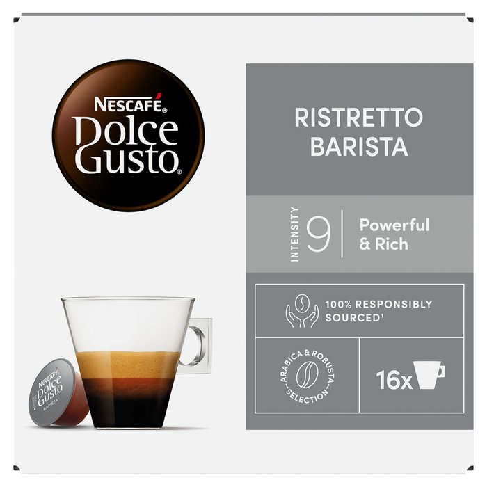 Velmi intenzivní tmavě pražená káva. Je menší než klasické espresso (35 ml) a intenzita 9/11 z něj činí silnou kávu s plným, sirupovitým tělem a hustou cremou. Tmavě upražená kávová zrna druhu robusta s kávovými zrny druhu arabika. S našimi hermeticky uzavřenými kapslemi, které uchovávají kávu čerstvou, si vychutnáte nápoje s bohatým aromatem, kdykoliv budete chtít. Balení obsahuje 16 kapslí pro 16 nápojů NESCAFÉ® Dolce Gusto® Barista
