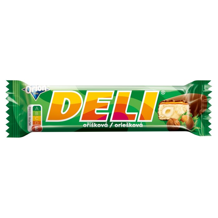 ORION DELI oříšková, tyčinka s lískovými ořechy a karamelem máčená v hořké polevě, 35g