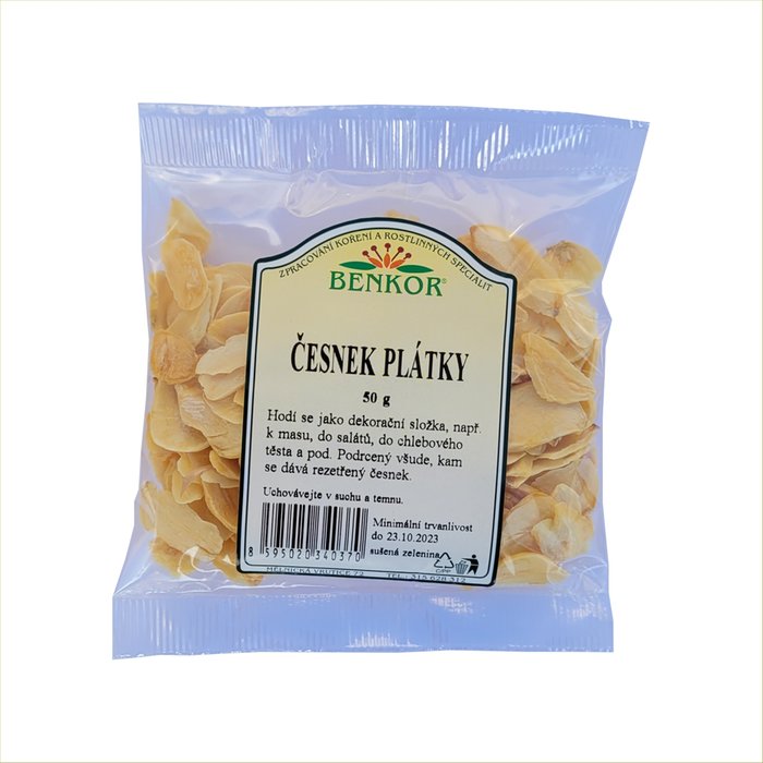 Sušené plátky česneku, díky kterým si v kuchyni ušetříte mnoho práce s loupáním a krájením česneku. Plátky se hodí také jako dekorační složka do některých pokrmů např. salátů, k masu, ale i do chlebového těsta.