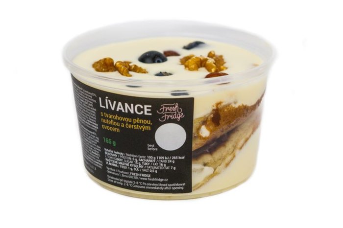 Tvarohová pěna 47 % (smetana 33%, plnotučný tvaroh, cukr, žloutek, citronová šťáva, citronová kůra, želatina (cukr, dextróza, jedlá želatina, modifikovaný bramborový škrob, zahušťovadlo)), Lívance 33 % (kefír, hladká mouka, vejce, cukr, jedlá soda, prášek do pečiva (dihydrogendifosforečnan sodný, hydrogenuhličitan sodný, kukuřičný škrob), sůl), nutella 8 % (cukr, palmový olej, lískové ořechy, odtučněné sušené mléko, kakaový prášek, sojový lecitin, vanilin), čerstvé ovoce v různých poměrech, směs ořechů v různých poměrech (vlašské ořechy, lískové ořechy)