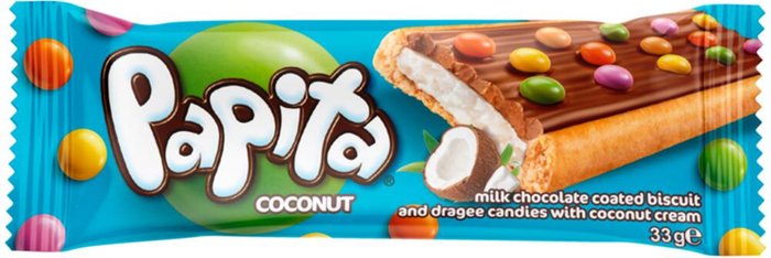 Sušenka (34%) (Pšeničná mouka (obsahuje LEPEK), rostlinný olej (palmový), cukr, fruktózový sirup, kypřící látky (E503, E450, E500), plnotučné sušené MLÉKO, sůl, emulgátor (slunečnicový lecitin). Mléčná čokoláda (33%) (Cukr, kakaové máslo, sušená MLÉČNÝ syrovátka, sušené plnotučné MLÉKO, kakaová hmota, emulgátor (fosfatid amonný), aroma), Kokosový krém (22%) (cukr, rostlinný olej (palmový), kokos (12%), sušená MLÉČNÁ syrovátka, sušené plnotučné MLÉKO), emulgátor (slunečnicový lecitin), aroma. Dražé v cukrové polevě (11%) (Cukr, rostlinný olej (palmový), sušená MLÉČNÁ syrovátka, rýžový škrob, kakaový prášek, zahušťovadlo (arabská guma), kukuřičný škrob, barviva (beta-karoten E160a, červená řepa, E150a, E141, E100), emulgátor (slunečnicový lecitin), leštící látka (karnaubský vosk), aroma). Mléčná čokoláda obsahuje nejméně 30% kakaové sušiny a nejméně 14% mléčné sušiny. Upozornění na alergeny: obsahuje MLÉČNÉ produkty a pšeničný LEPEK. Může obsahovat stopové množství ARAŠÍDŮ, lískových OŘÍŠKŮ, PISTÁCIÍ, MANDLÍ, vlašských OŘECHŮ, SÓJOVÉHO lecitinu, SEZAMU a jiných semen a VEJCE
