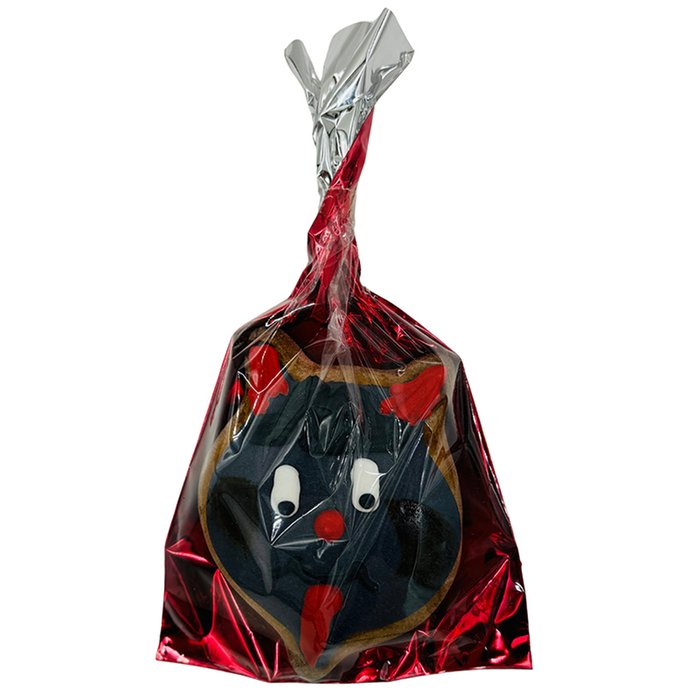 Korpus 68% (pšeničná mouka, cukr, voda, pekařský med, pasterovaná vaječná melanž, jablečná složka (jablečný protlak 50%, cukr, voda, regulátor kyselosti E330, pektin E440, konzervant E202, aroma), kypřící látka E503ii, perníkové koření, jedlá soda), modelovací hmota 23% (cukr, fondán (cukr, glukózový sirup, voda, regulátor kyselosti E330), sušené mléko, glukózový sirup, rostlinný tuk palmový, voda, aroma), ozdoba 9% (cukr, vaječný bílek (vaječný bílek 90%, voda, konzervant E202, regulátor kyselosti E270, E331, stabilizátor E415), barviva (E150d, E129, E102, E122, E133) modifikovaný škrob. Barviva E 102, E 122, E129 mohou nepříznivě ovlivňovat činnost a pozornost dětí. Výrobek může obsahovat stopy: podzemnice, sóji, skořápkových plodů, sezamu, oxidu siřičitého, siřičitanů a lupiny.