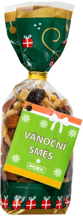 zpracované ovoce s perníkovým kořením v různém poměru 64, 5% (rozinky, proslazené kousky pomerančové kůry (pomerančová kůra 53%, cukr, glukózo-fruktózový sirup, regulátor kyselosti: kyselina citronová), perníkové koření mleté 0, 5% (skořice, muškátový ořech, koriandr, zázvor, fenykl, hřebíček, nové koření, anýz, badyán, pepř černý, kardamon)), jádra mandlí pražená 35%.
