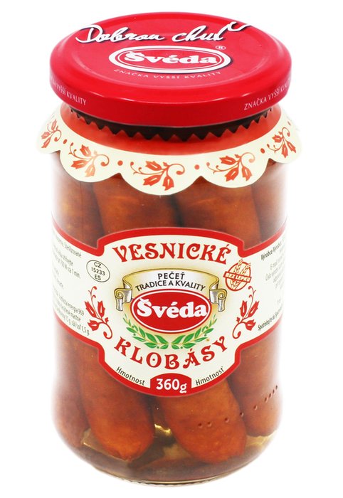 klobásy 61% [vepřové maso 71 %, hovězí maso 23%, voda, jedlé kolagenní střívko, kořenící směs ( glukózový sirup, látky zvýrazňujícé chuť a vůni E621, E635, stabilizátor E451, sušená zelenina (česnek), antioxidant E316, extrakry koření, barvivo ( karmína)], lák 39% (voda, jedlá sůl).