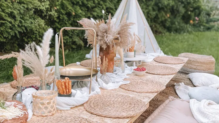 Ta je také jeden z dalších kroků k tomu, aby byla vaše pikniková oslava nezapomenutelná. V dnešní době máme neomezené možnosti, kde takové dekorace sehnat, a to za velmi příjemné ceny. Na stole by neměly chybět jak nízké dekorace - malé svícny, malé vázičky, tak ty vysoké jako třeba svícny s vysokými svíčkami, které vytvoří tu správnou boho atmosféru. Perfektně poslouží ručně nasbírané klasy obilí, sušené makovice, luční kvítí nebo všemožné větvičky. Hodit se vám budou i pírka nebo nástěnné dekorace Macrame, svázané z nití a šňůrek.