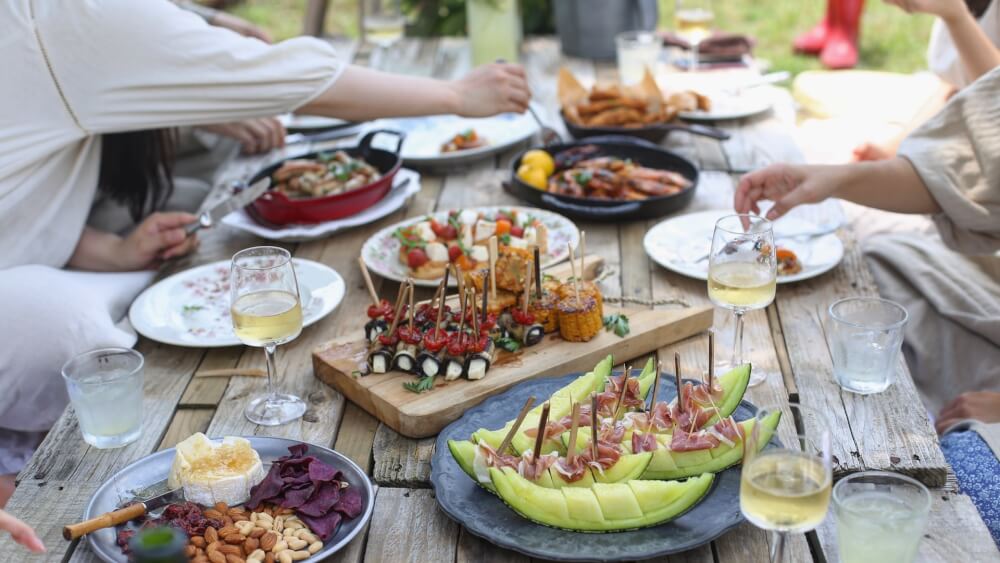 Na většině takových událostí stoly přetékají jídlem a vy máte na výběr nespočet variant. Volte proto chytře. Snažte se myslet na bílkoviny (libové maso nebo grilovaný sýr), tvořit by měly 1⁄4 talíře. Přílohy není nutné vynechávat, z talíře tvoří další 1⁄4. Zbytek talíře doplňte zeleninou v různých podobách: ať už to bude zelenina z grilu, nebo barevný salát. Příliš mnoho smaženého nám obvykle nedělá dobře a navíc v kombinaci se sladkým a alkoholem se jedná o pohromu pro naše trávení.