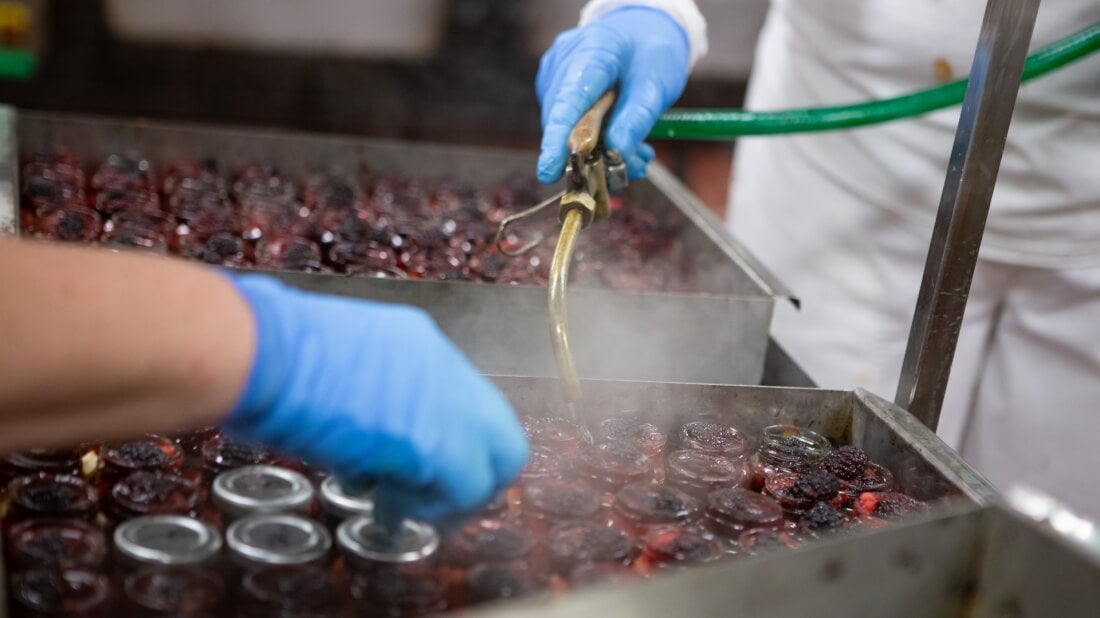 Celý proces je fyzicky náročný, protože se při zpracování plodů pracuje s vysokými teplotami. Nejprve je třeba, aby si lidé ve výrobě nasadili dva páry rukavic. Vybrané ovoce se v prvním kroku plní do čistých skleniček vyskládaných na plechu, dle nastavených gramáží. Poté je každá ovocná várka zalita horkým cukrovým rozvarem a samotné skleničky podlity vodou.