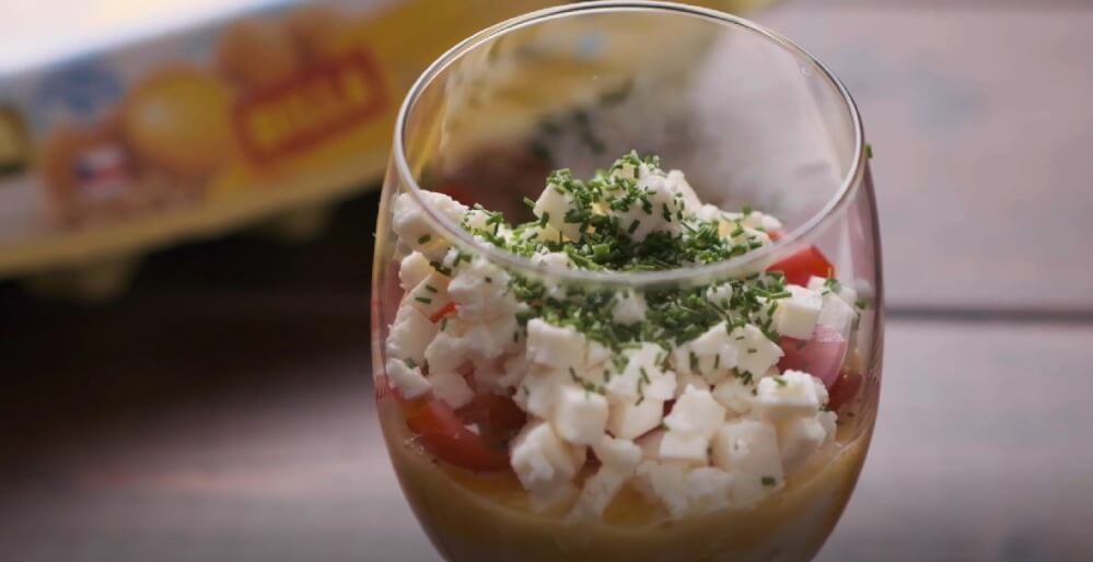 - Uvařená vejce servírujte do skleničky a zbylou vodu ze dna misky vylijte.