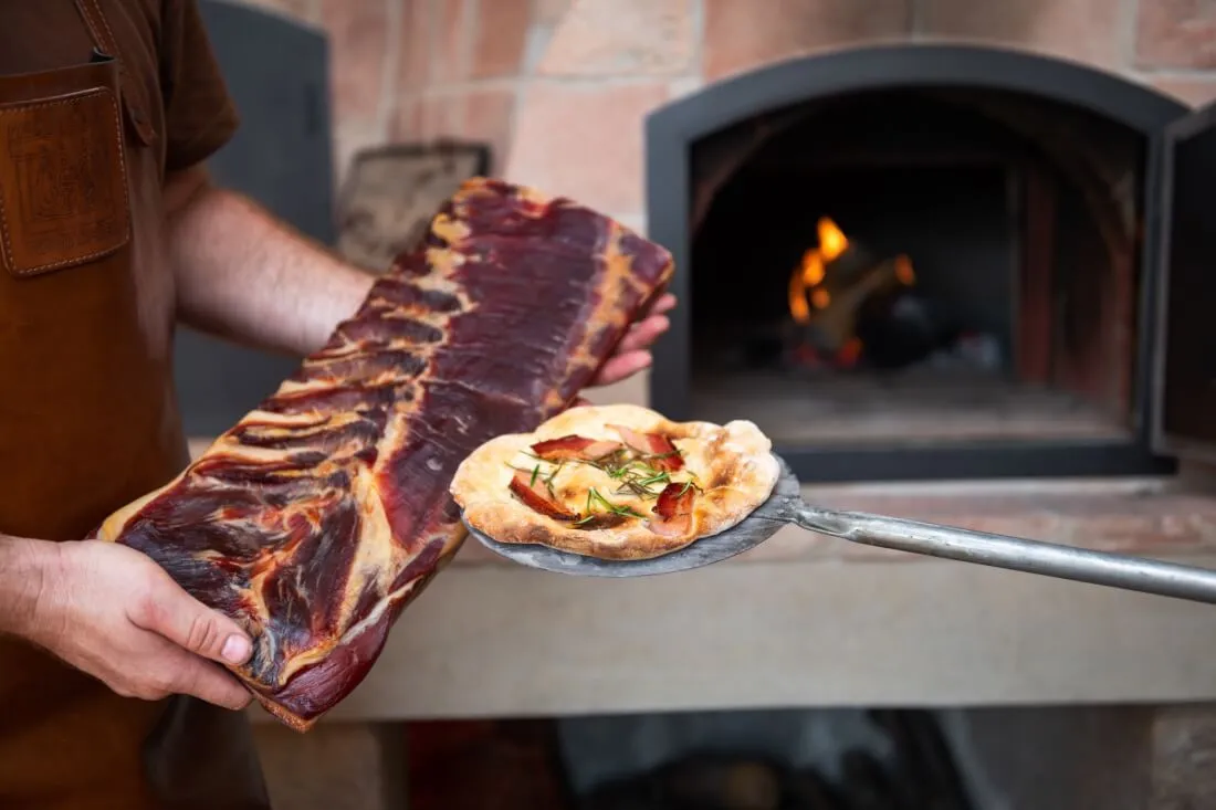 Samozřejmě, ani ochutnávku jsme nemohli vynechat. A výborné bylo opravdu všechno, co jsme od majitelů dostali na talíř. Navíc jsme si otestovali, jak takový pršut zužitkovat při vaření. Jedna z milých sousedek pana Chovanečka má u svého domu fantastickou pec, ve které peče domácí chleba pro vlastní potřebu, ale půjčuje ji i ostatním lidem z vesnice. V ten den měla navíc zadělané těsto na domácí focacciu, takže bylo jasno. Voňavé pečivo se zapečeným pršutem, bylinky a olivový olej. Co víc si přát.