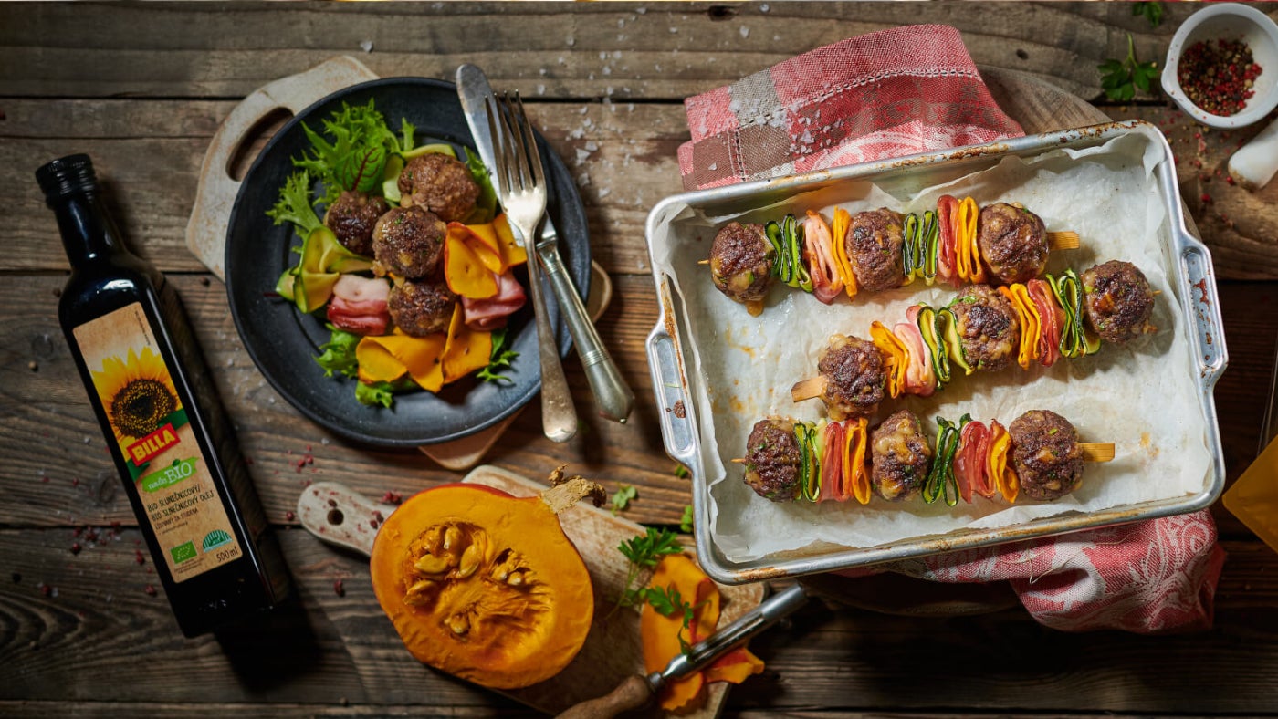 Na špejli postupně napichujte masové kuličky, plátky dýně, cukety a slaniny.