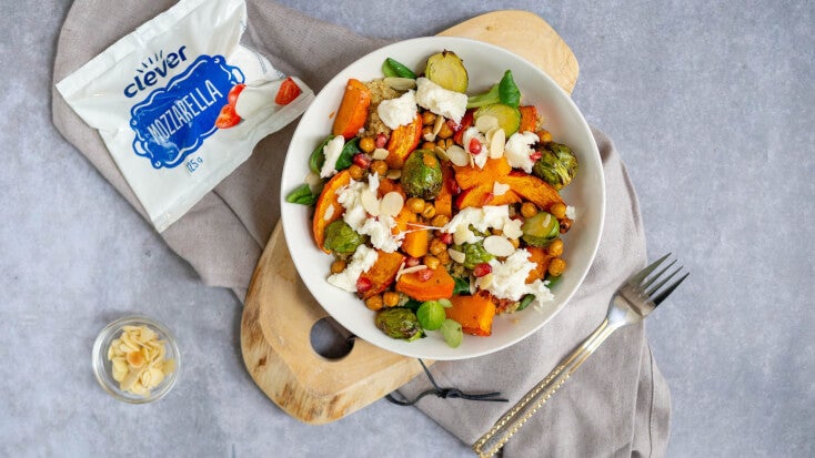 Na to přidejte pečenou zeleninu, cizrnu, natrhejte mozzarellu a ozdobte plátkovými mandlemi. Pokud máte, přidejte i granátové jablko. Salátu dodá zajímavý křupavý element.