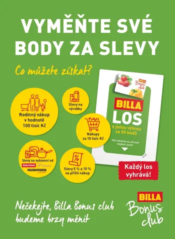 Obchodní řetězec BILLA připravil členům BILLA Bonus clubu kampaň s názvem „Vyměňte své body za slevy“. Se začátkem nového roku představí BILLA svůj věrnostní klub ve vylepšeném kabátě s řadou novinek a vychytávek. Zákazníci proto nyní mohou vyměnit své doposud nasbírané body za zajímavé slevy a odměny. Akce na výměnu bodů startuje 4. října a potrvá do 31. října.