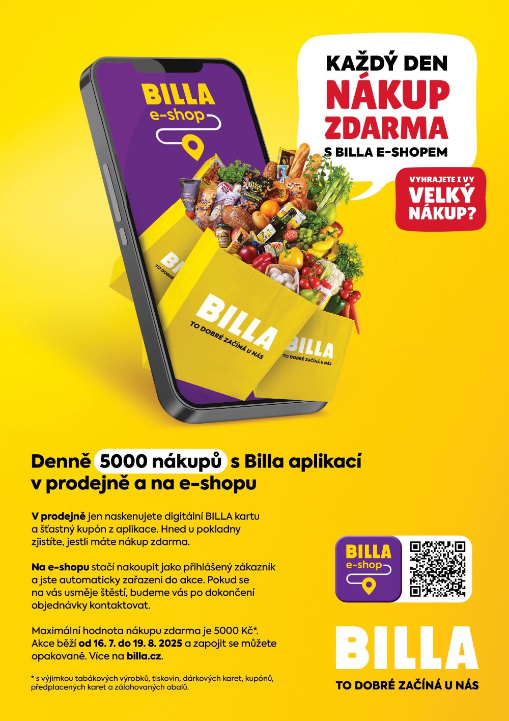 Každý zákazník, který je registrovaným členem BILLA klubu a který pořídí svůj nákup do 19. srpna v prodejnách BILLA napříč Českou republikou, anebo zákazník e-shopu BILLA, má šanci na získání svého nákupu zdarma. Až 5000 výher denně čeká na své výherce a ti pro výhru nemusí udělat cokoliv navíc, než že nakoupí ve své oblíbené prodejně BILLA každodenní nákup. Dohromady tak má šanci na výhru až 175 000 zákazníků.