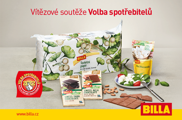 - Ocenění Volba spotřebitelů 2022 získaly v kategorii Novinka roku čtyři produkty privátních značek společosti BILLA - BILLA BIO Swiss Fine Dark chocolate 85 % a BILLA BIO Swiss Almond Brittle Chocolate, BILLA Mini mozarella a BILLA toaletní papír recyklovaný třívrstvý.
